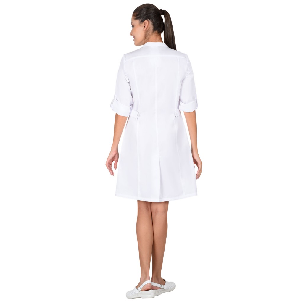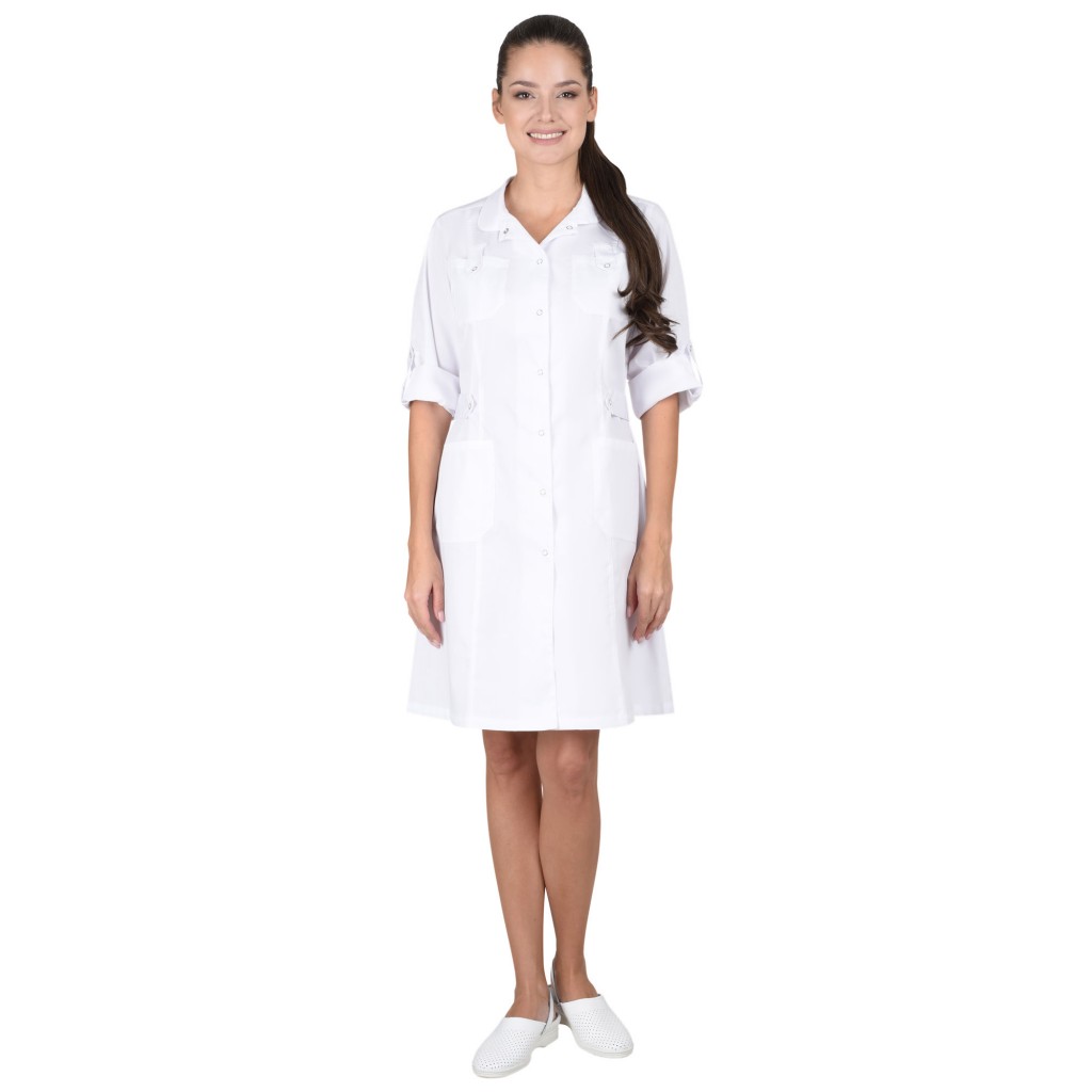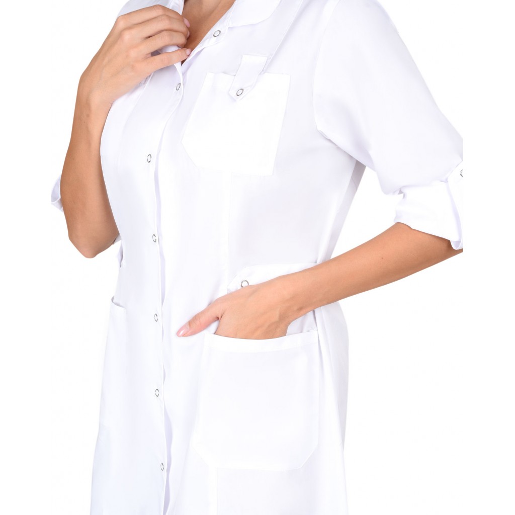 - Описание: Халат полуприлегающего силуэта, с центральной застежкой на 7 рубашечных кнопок, воротник-стойка, рельефные швы, верхние карманы с хлястиками, застегивающимися на рубашечные кнопки, нижние накладные карманы. По боковым швам халата фигурные хлястики, регулирующие ширину халата по талии при помощи рубашечных кнопок. Рукав 3/4.