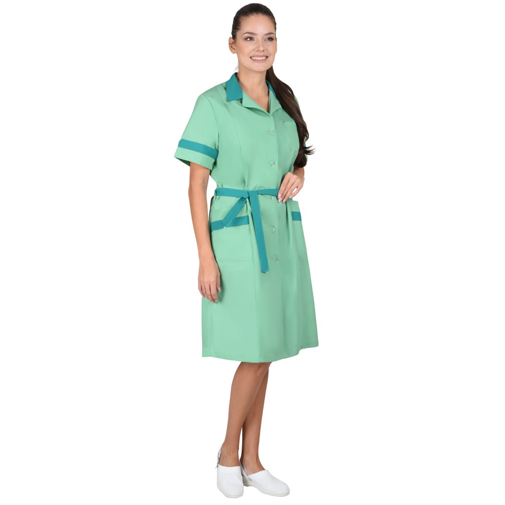 - Описание: Халат женский укороченный, полуприлегающего силуэта, с центральной застежкой на пуговицы, с рельефными швами, с одним верхним у двумя нижними накладными карманами, воротник отложной. По талии в шлевках продет пояс.