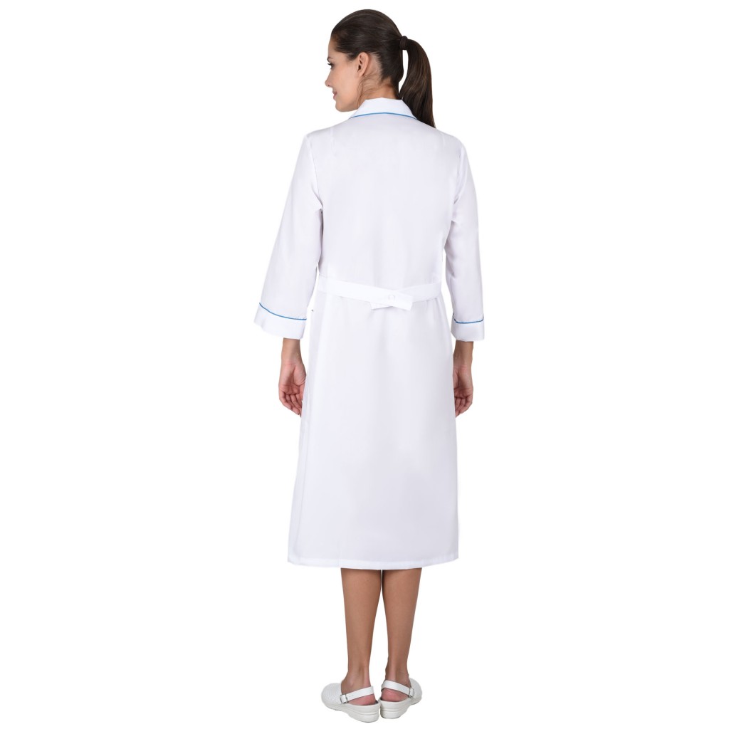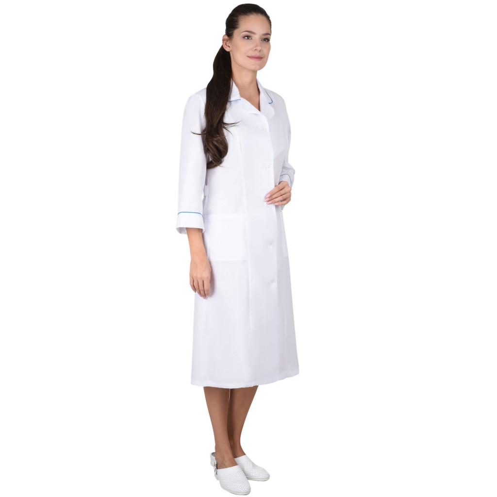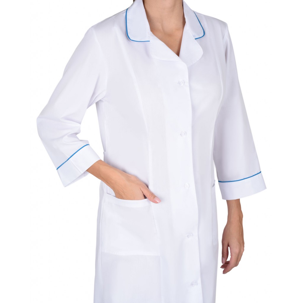 - Описание: Халат с отложным воротником и нижними накладными карманами, по вороту и манжетам рукавов отделка в виде канта контрастного цвета. Рукава 3/4.