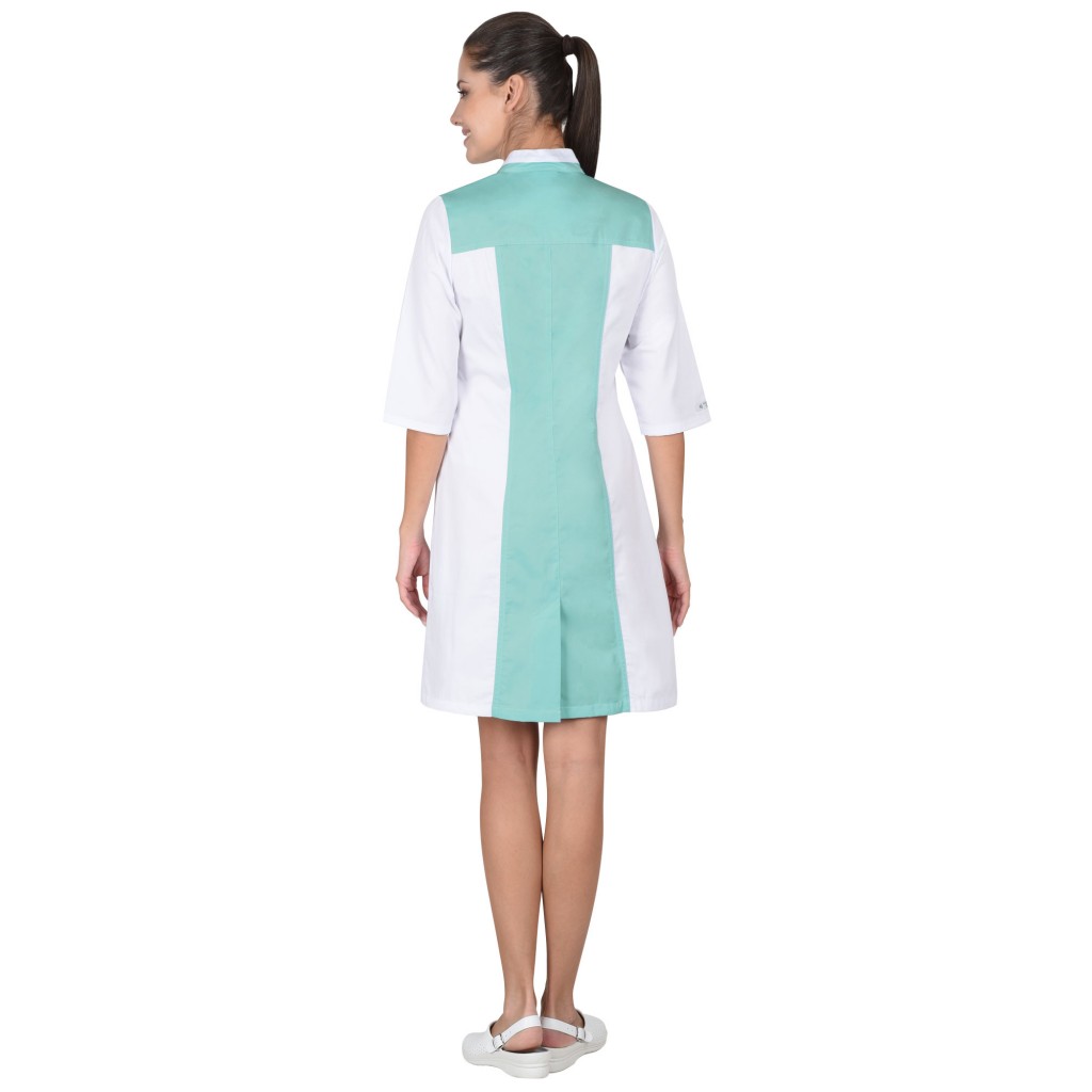 - Описание: Халат женский, полуприлегающего силуэта с центральной застёжкой на пуговицы, с верхним и нижними фигурными карманами. Воротник «стойка». Рукава втачные, укороченные. Детали халата выполнены из отделочной ткани. По спинке шлица.