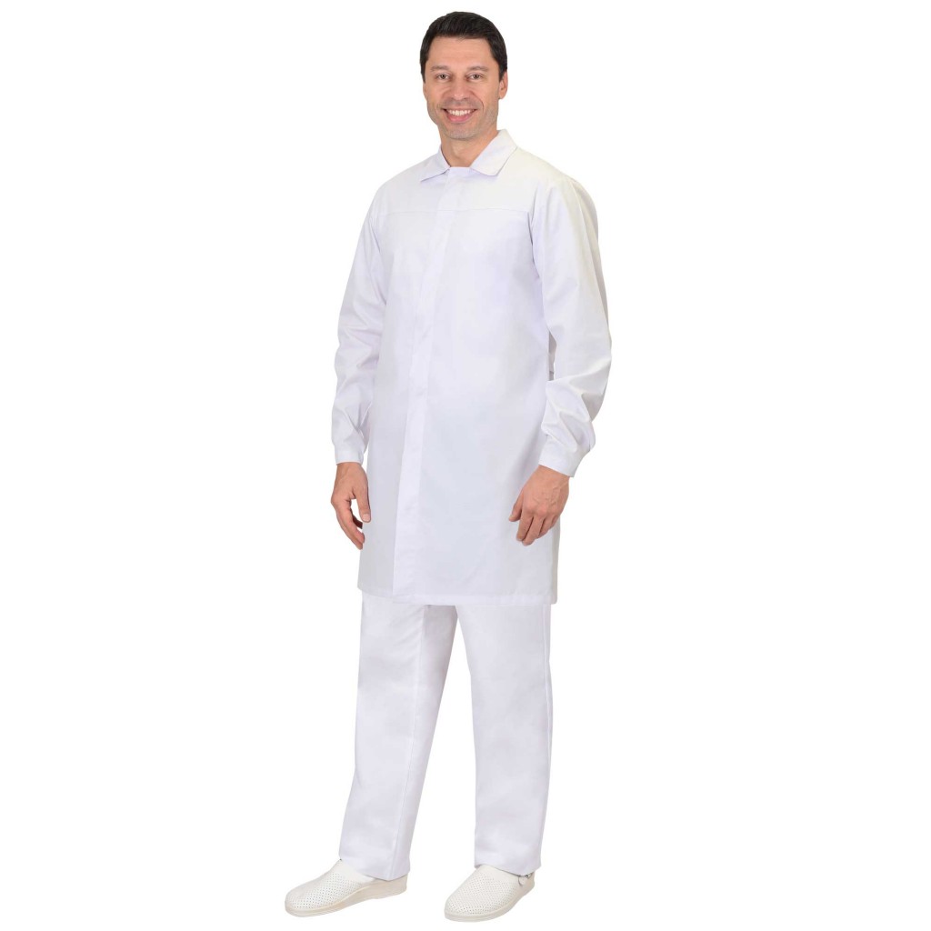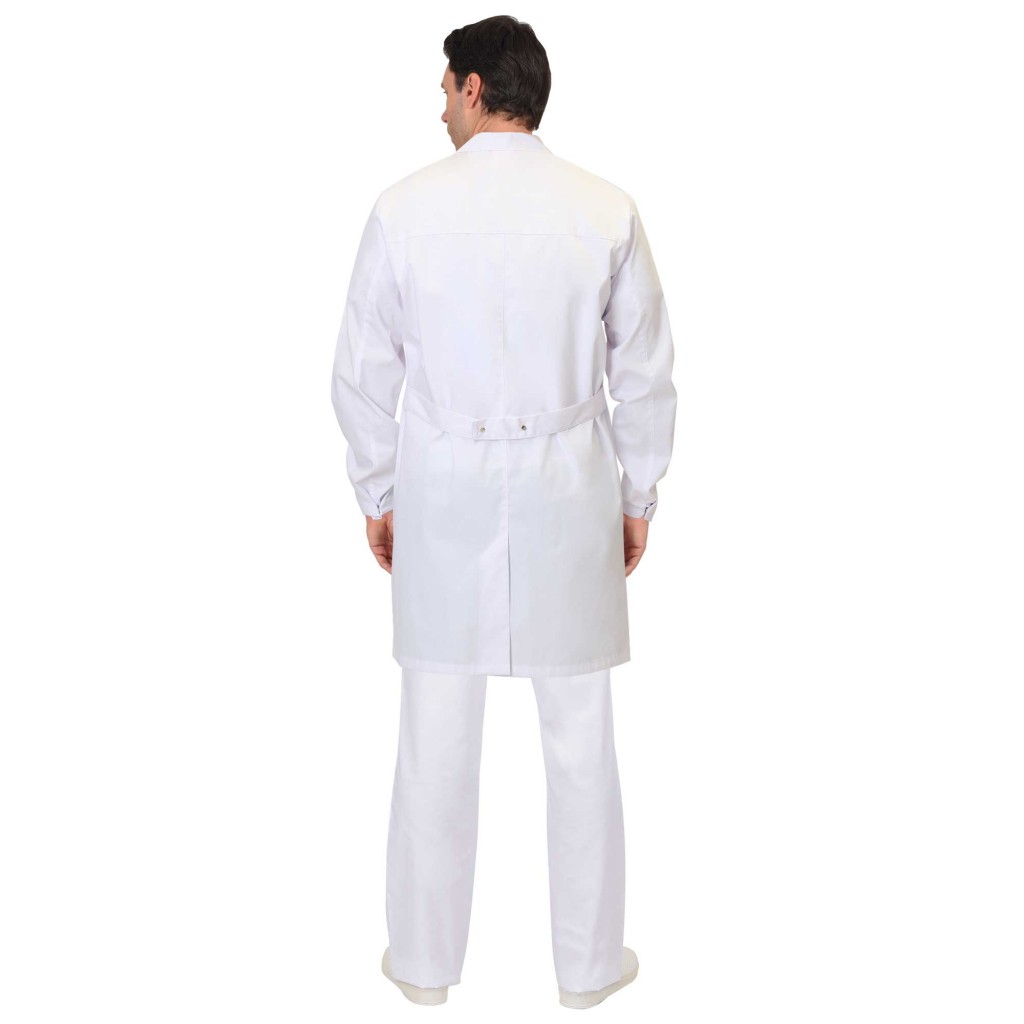 - Описание: Халат мужской прямого силуэта с длинными рукавами, центральной застежкой на потайные кнопки и втачным отложным воротником. Внутренний нагрудный карман и внутренний карман на правом рукаве для пропуска.