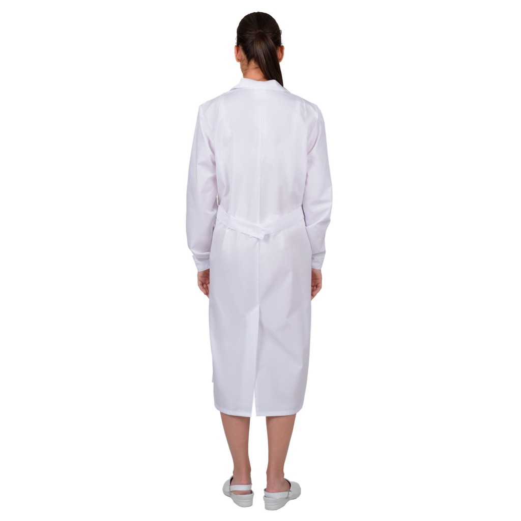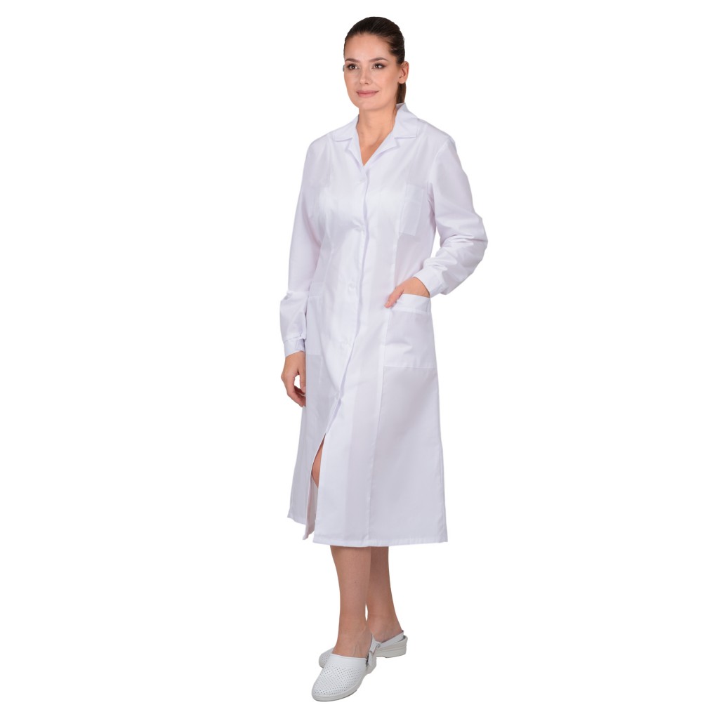 - Описание: Классическая модель с нагрудным и двумя нижними накладными карманами, отложным воротником и длинными рукавами с манжетами. Ширина халата по линии талии регулируется хлястиком.