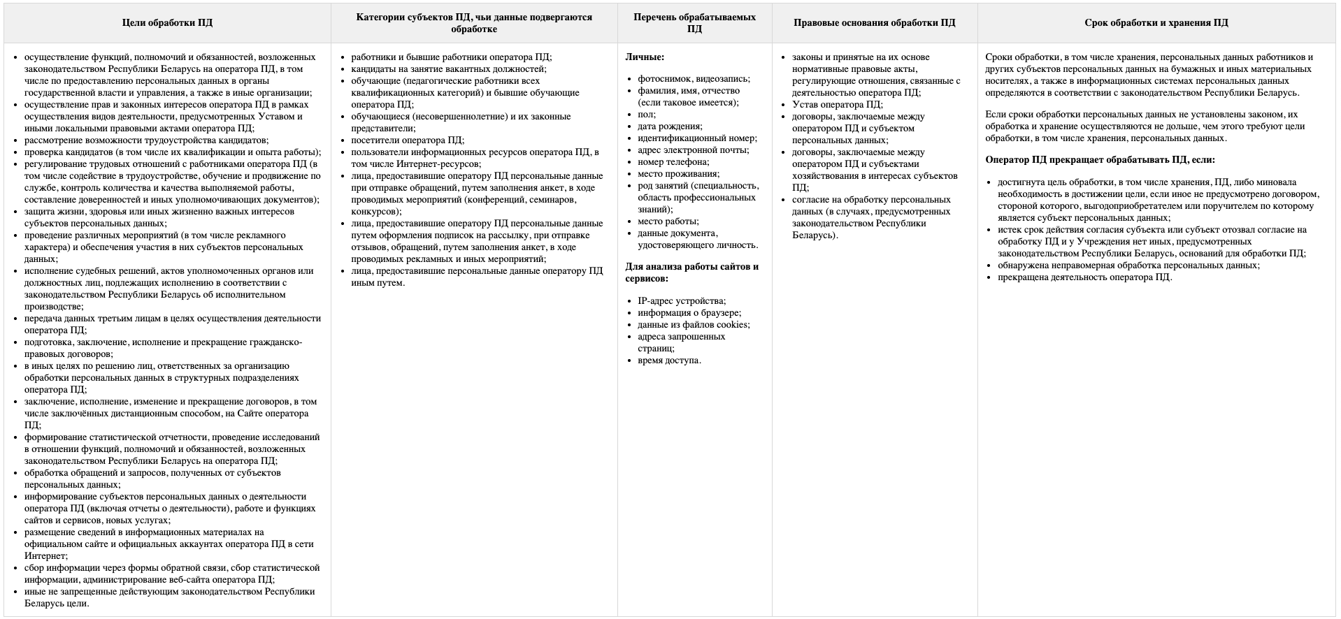 2.1. Оператор ПД осуществляет обработку персональных данных субъектов персональных данных в целях, объеме, на правовых основаниях и в сроки применительно к каждой категории субъектов персональных данных согласно приложению 1 к настоящей Политике.