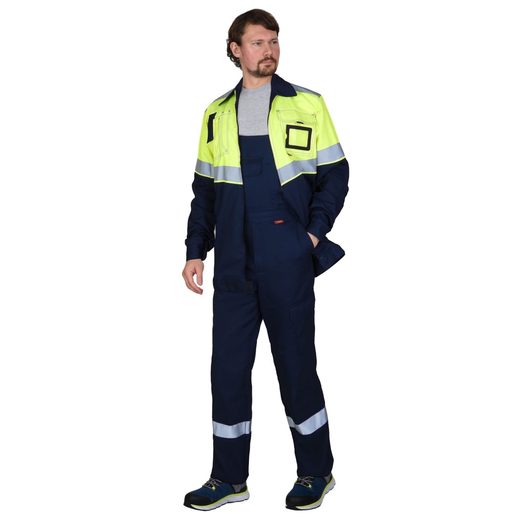 Костюм летний состоит из куртки и полукомбинезона, в костюме предусмотрена светоотражающая полоса для сигнальной видимости.