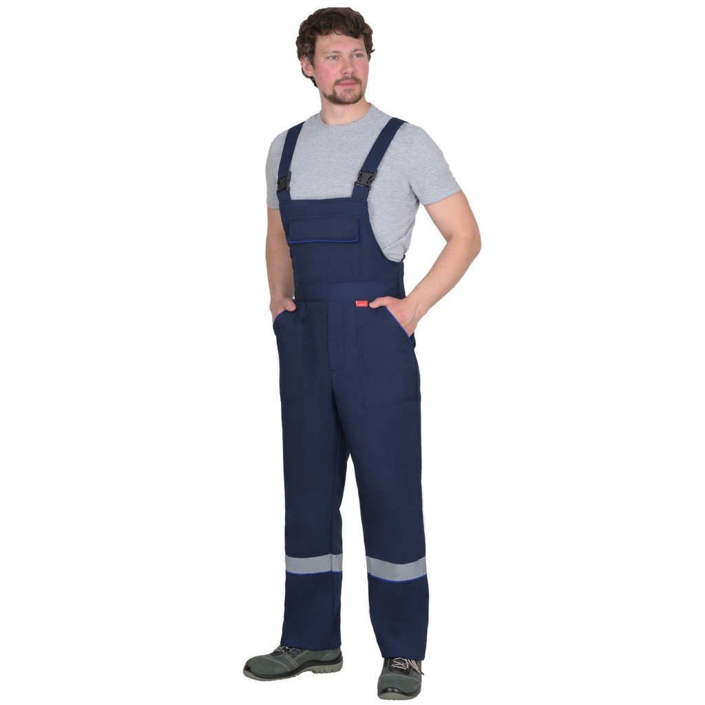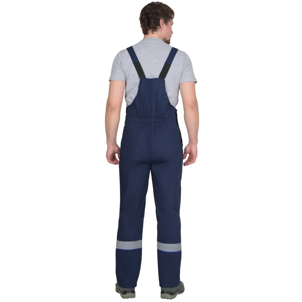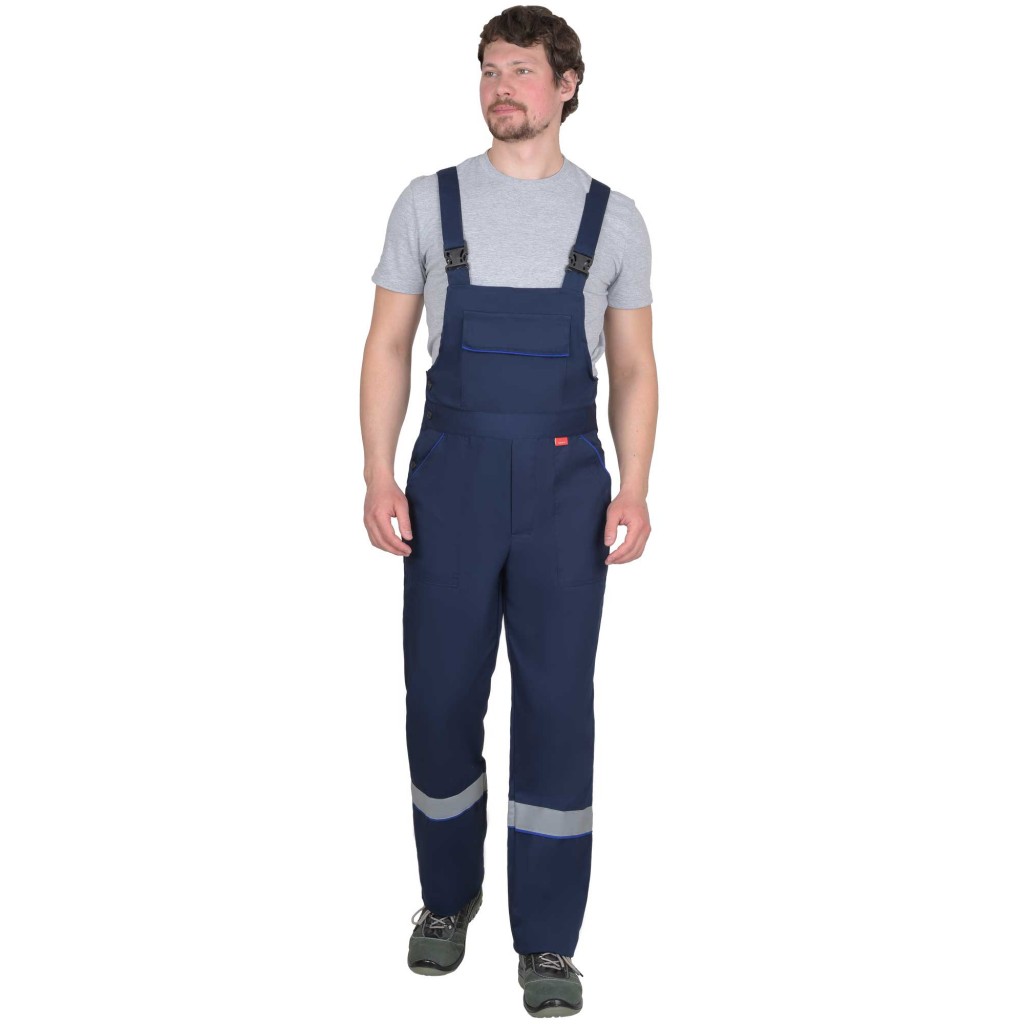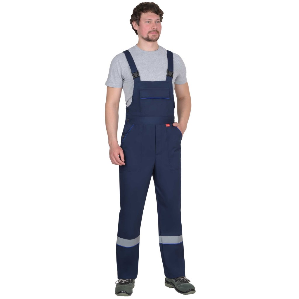 Полукомбинезон прямого силуэта, с застежкой спереди и с правого бока на пуговицы, с резинкой сзади для прилегания по фигуре, с накладными карманами спереди и карманами для инструмента сзади.