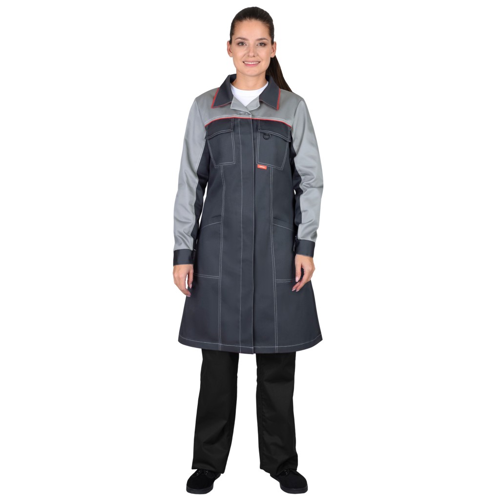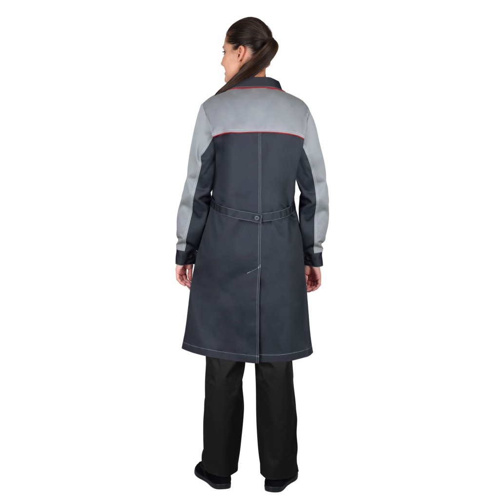 Халат женский полуприлегающего силуэта, с центральной застёжкой на пуговицы, с отложным воротником с лацканами, с втачными рукавами с манжетой на пуговице, с нагрудными и нижними накладными карманами, шлицей в среднем шве спинки, на спинке хлястик с пуговицей для регулировки объёма по талии. В халате предусмотрено крепление бейджа.