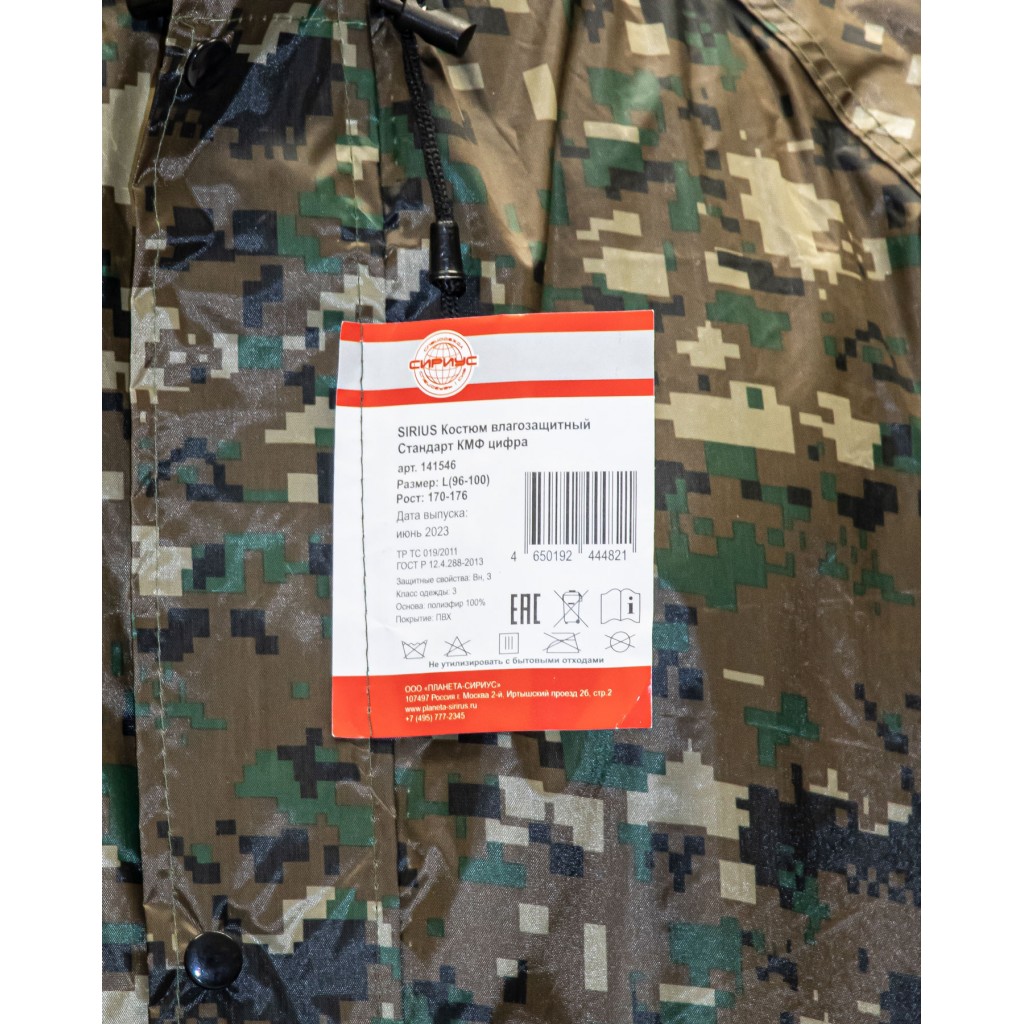 - Описание: Костюм влагозащитный SIRIUS Стандарт (210 гр/м?) с камуфляжным рисунком «цифра» предназначен для защиты от дождя, ветра, снега, загрязнений и химических факторов (например, нефтяных масел).