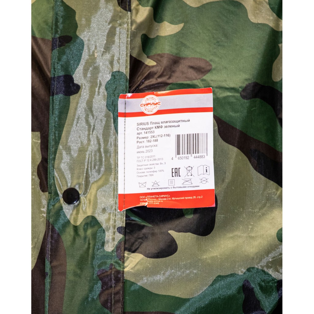 - Описание: Плащ влагозащитный SIRIUS Стандарт (210 гр/м?) с камуфляжным рисунком предназначен для защиты от дождя, ветра, снега, загрязнений и химических факторов (например, нефтяных масел).