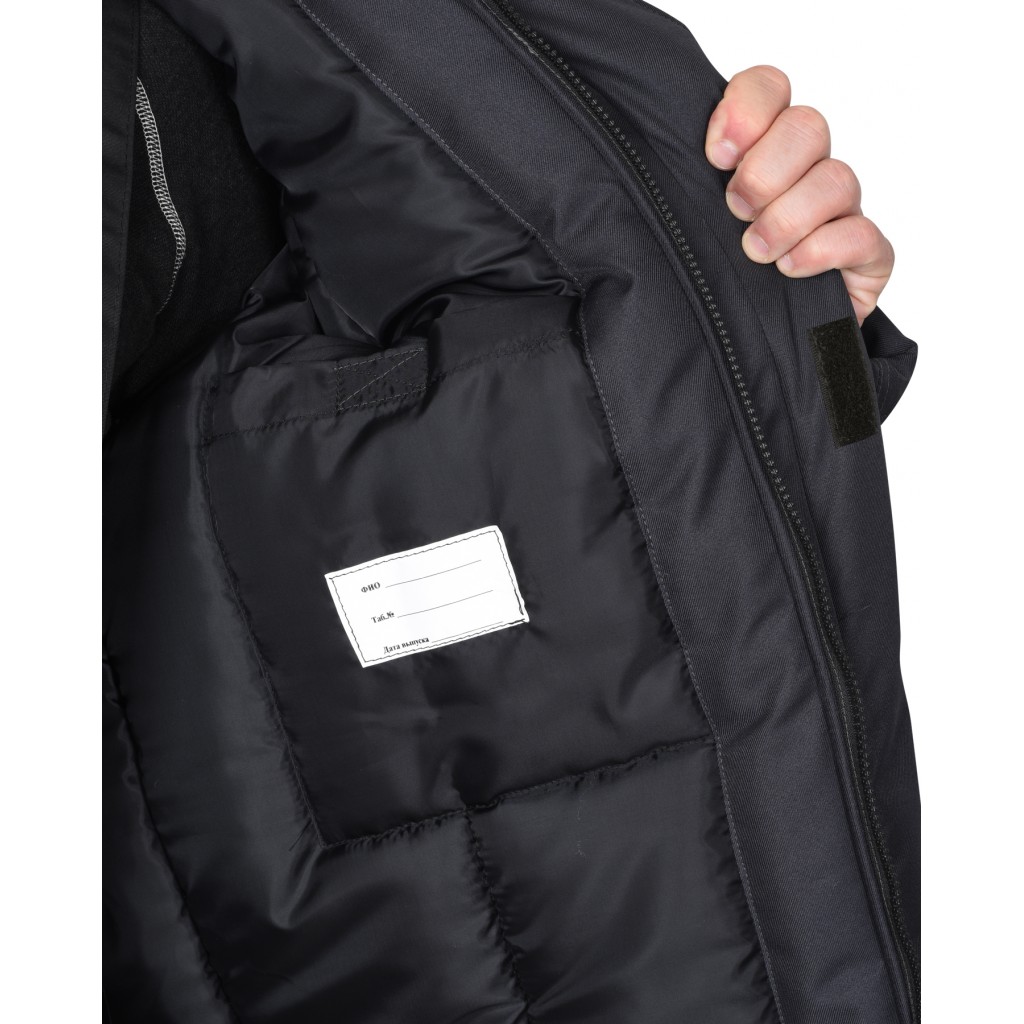 Куртка прямого силуэта, удлинённая, с креплением для бейджа, с втачным капюшоном и воротником стойка, с центральной застёжкой на молнию от края воротника до низа куртки, накрытую ветрозащитным клапаном с потайными липучками. Куртка с нижними прорезными карманами с листочками. Рукава втачные с внутренними трикотажными манжетами. Подкладка куртки утепленная, с внутренним карманом, застегивающимся на липучку. В куртке предусмотрен СВ-кант, для обеспечения сигнальной видимости.
