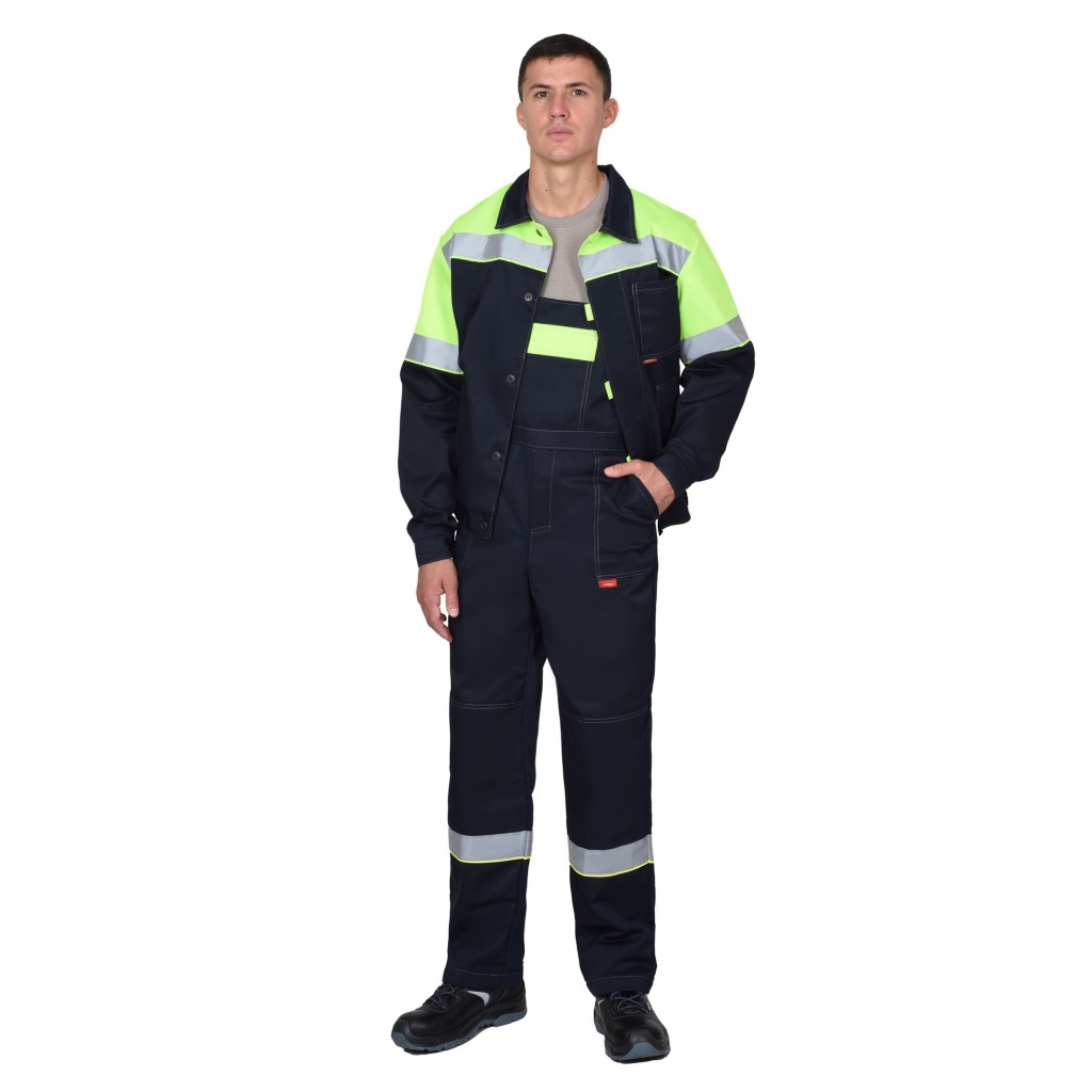 Полукомбинезон прямого кроя, с застежкой в правом боковом шве на пуговицы и спереди - гульфик с молнией. Полукомбинезон с нагрудным карманом с клапаном, боковыми карманами и с наколенниками. В полукомбинезоне предусмотрена лента светоотражающая ш.50 мм для сигнальной видимости.