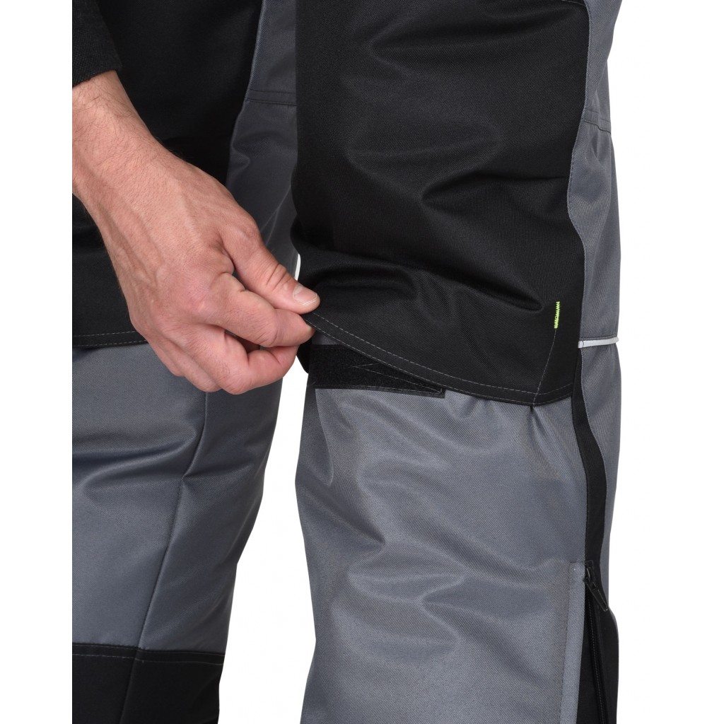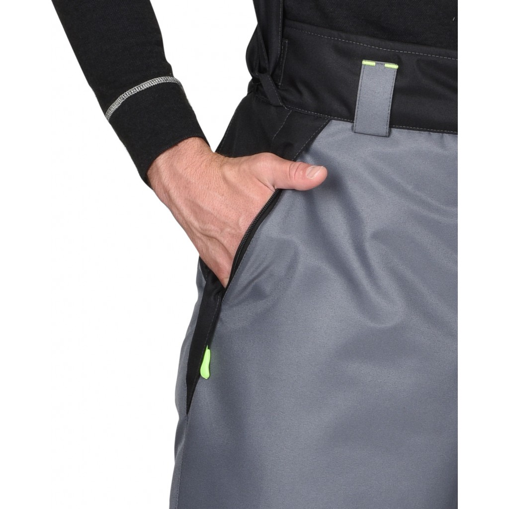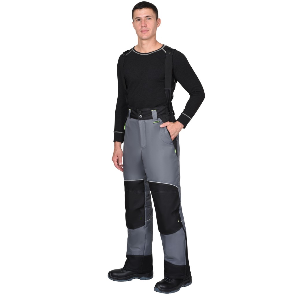 Брюки прямые, на утеплённой подкладке, с застежкой в среднем шве передних половинок на гульфик с молнией, с отрезным фигурным широким поясом с застежкой на пуговицы, со шлевками, с хлястиками по бокам на липучках, с внутренними боковыми карманами на молнию, с объемными наколенниками. Понизу боковых швов разрезы, застегиваются на молнию. В брюках предусмотрены петли для пристегивания бретелей и съемные бретели.