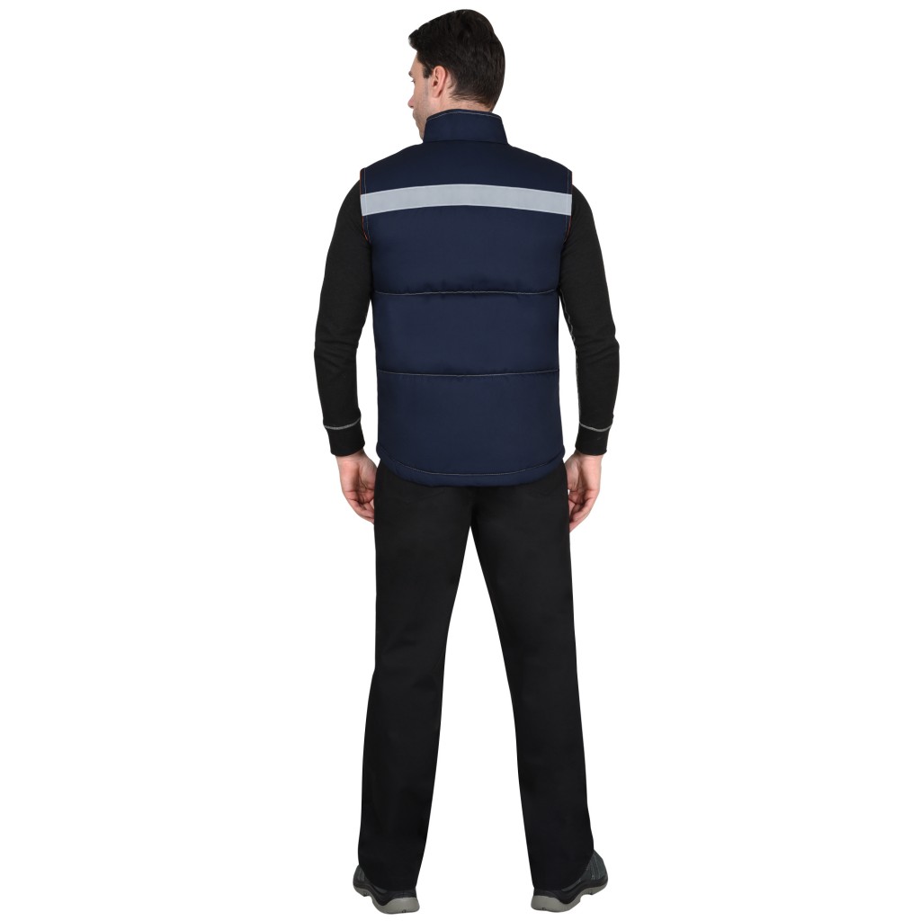 Жилет утеплённый, стёганый, прямого силуэта, на подкладке, с центральной застёжкой на молнию, накрытую ветрозащитным клапаном с кнопками, нижними прорезными карманами, нагрудными накладными карманами с клапаном, внутренним карманом на подкладке с молнией, с воротником стойка. Жилет со светоотражающими полосами для обеспечения сигнальной видимости.
