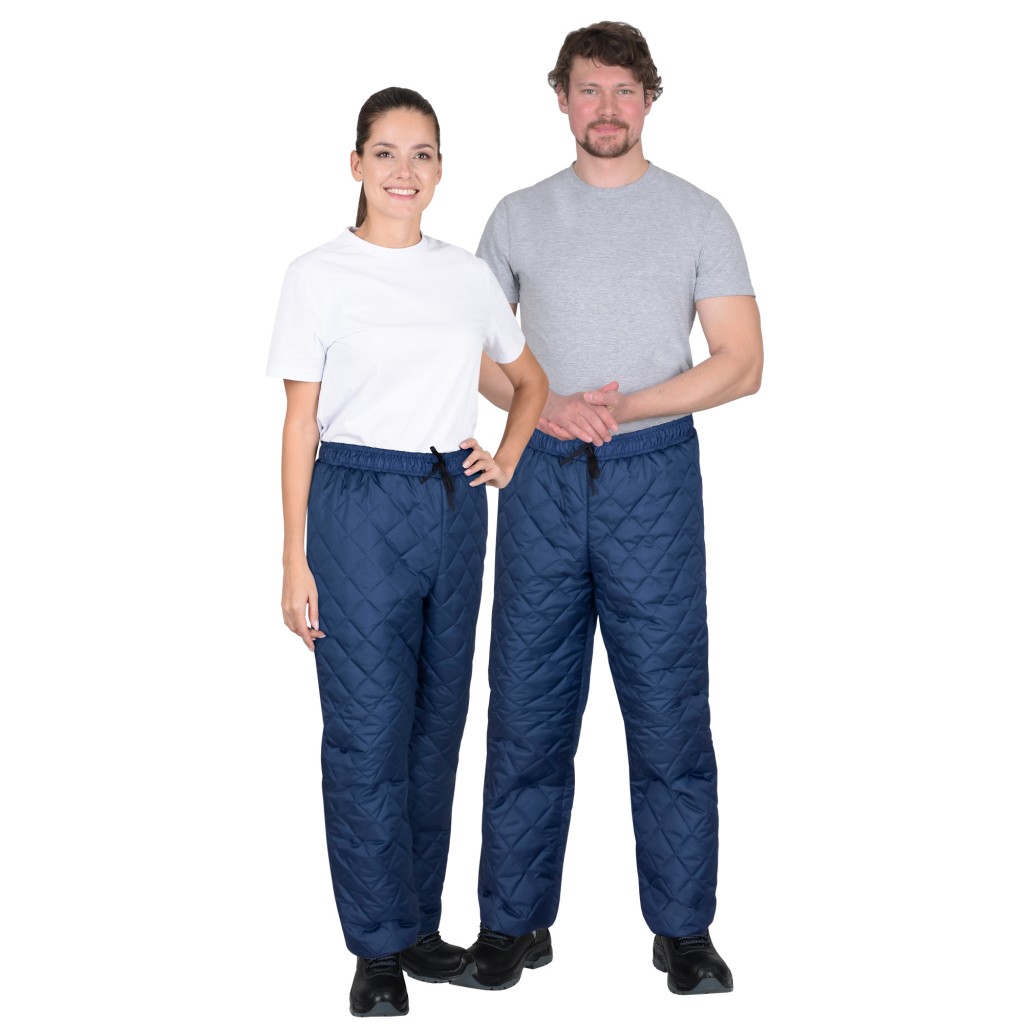 Брюки утеплённые, стёганые в виде ромбов (термостёжка), на подкладке, прямого силуэта, без боковых швов, без карманов, на поясе, стянутым на эластичную тесьму, по низу брюки с трикотажными манжетами.