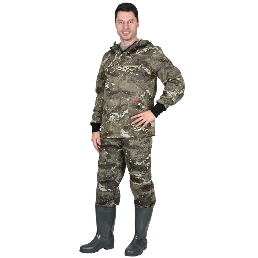 - Описание: Костюм "Антигнус-СТ" состоит из куртки и брюк. Куртка прямого силуэта, с центральной застёжкой в верхней части куртки на молнию, с капюшоном и москитной сеткой. Сетка убирается во внутренний нагрудный карман и застегивается на пуговицу. На нижней части куртки расположены нижние накладные карманы, закрытые клапаном. На полочках, спинке и рукавах имеются клапаны-ловушки. Низ рукавов с трикотажной манжетой. Рукава с налокотниками в области локтя. По низу куртки вставлен шнур и двойной фиксатор.