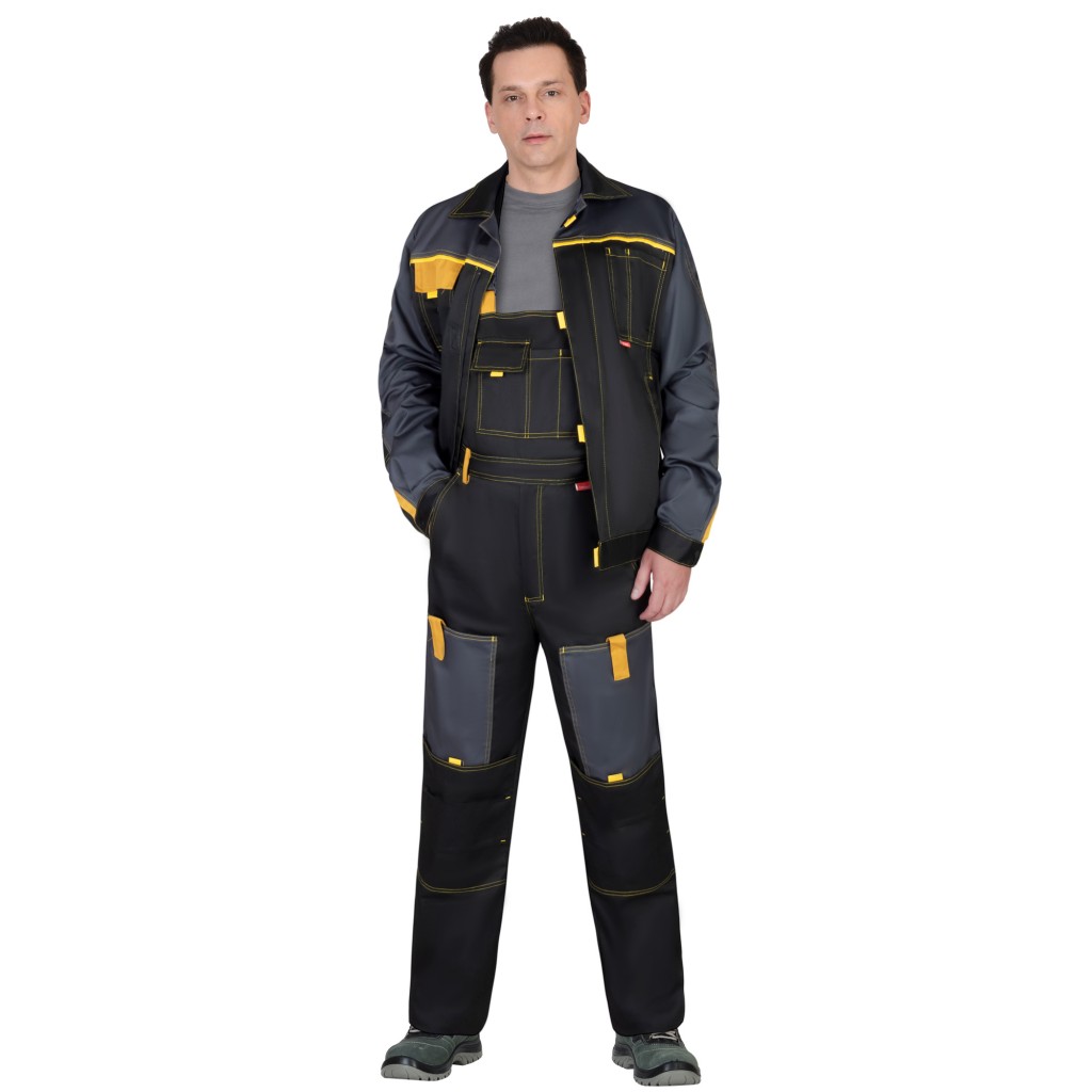Полукомбинезон прямого силуэта, с застёжкой на молнию: спереди на гульфик и в правом боковом шве, с боковыми карманами на передних половинках, с задним карманом и с двойными накладными карманами для инструментов на правой задней половинке, с усиленными накладками в области колен. По спинке полукомбинезона резинка для лучшего прилегания. Полукомбинезон с бретелями, длина регулируется резинкой и застежкой-фастексом.