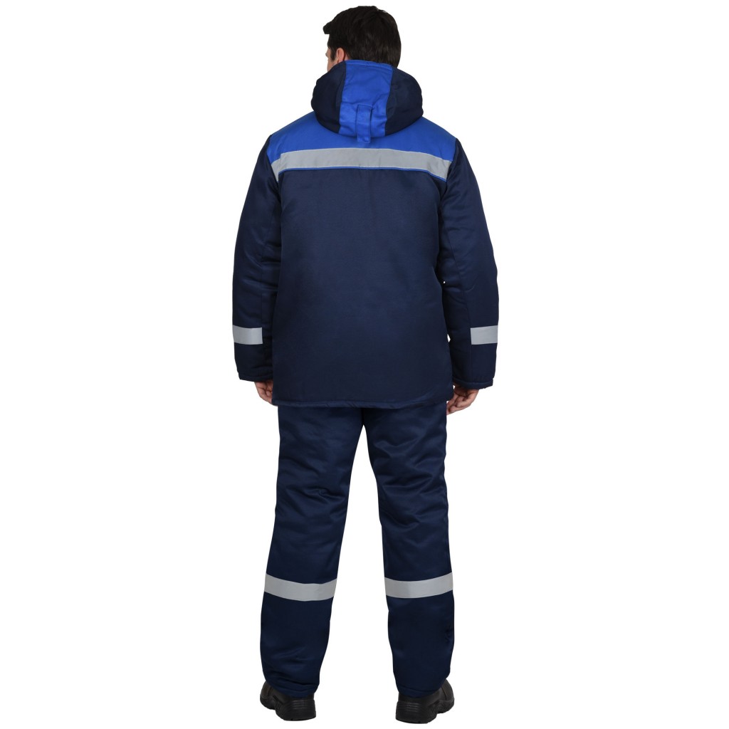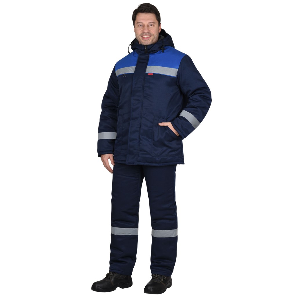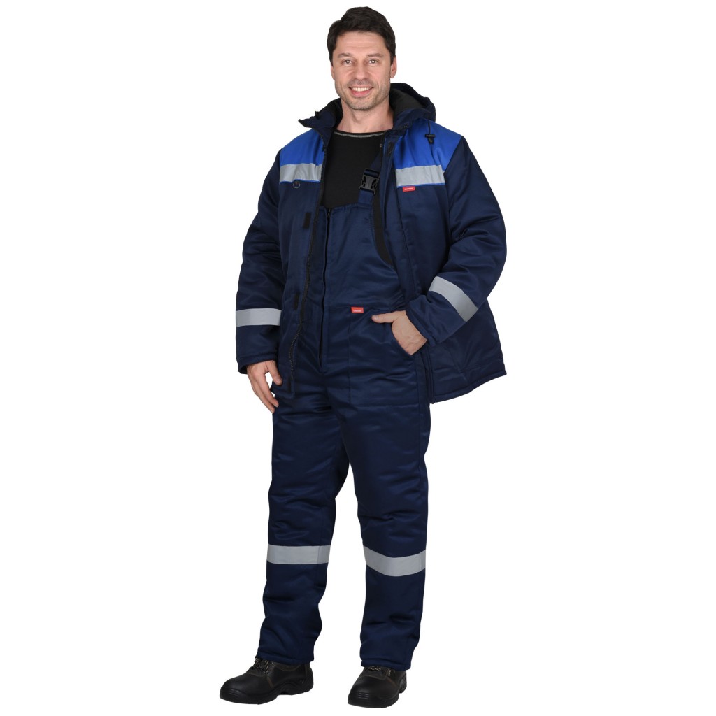 Костюм зимний состоит из куртки и полукомбинезона, костюм со световозвращающей лентой 50 мм для обеспечения сигнальной видимости.