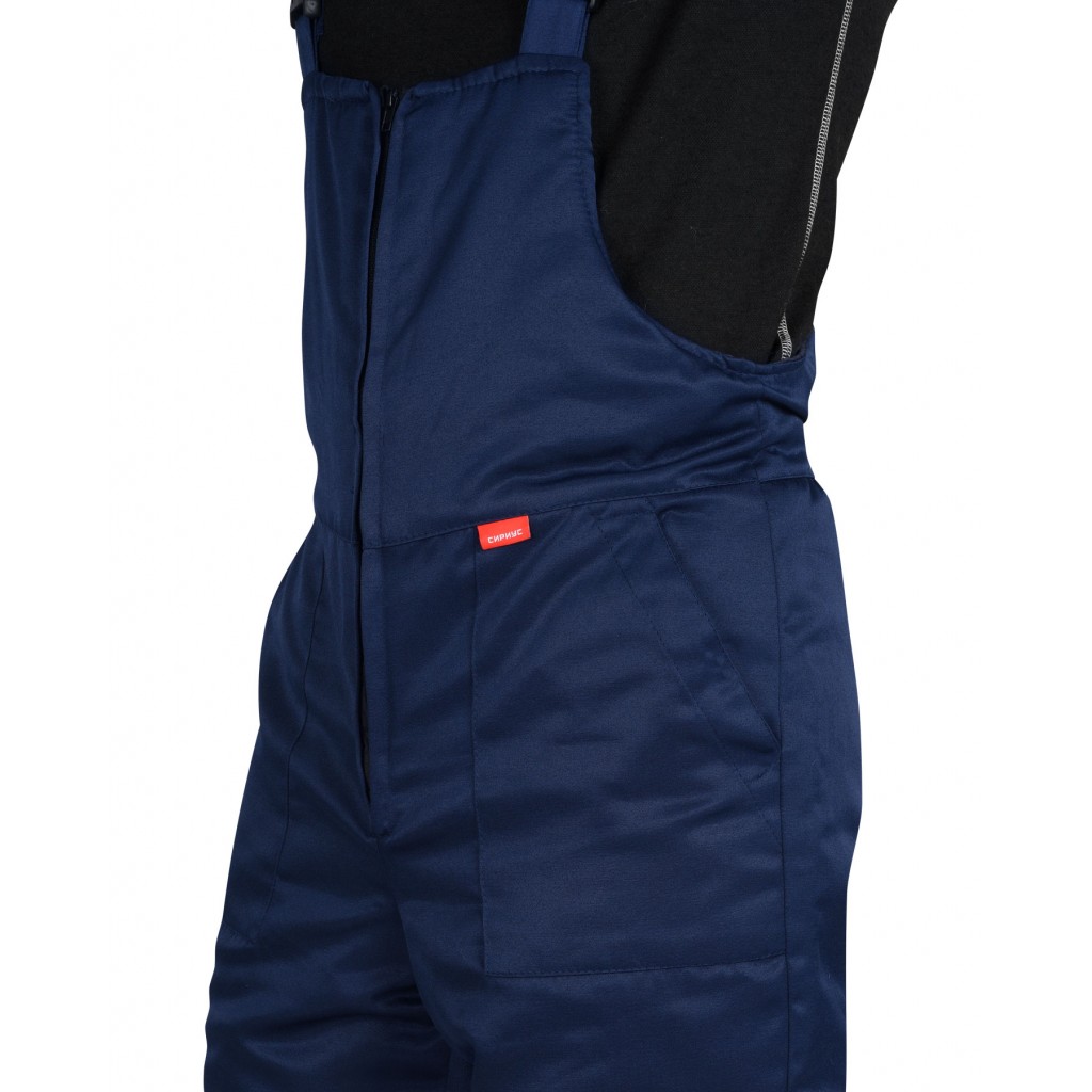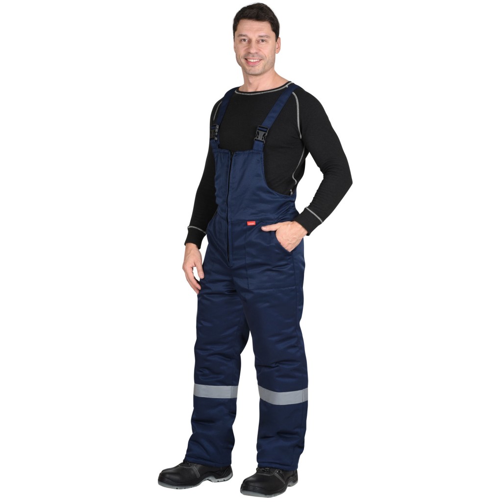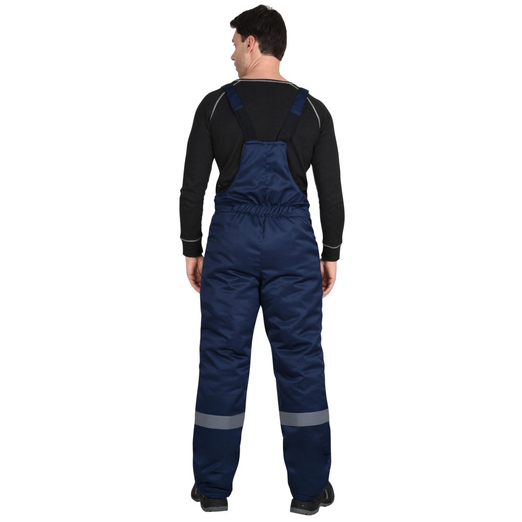 Полукомбинезон прямой, на утепленной подкладке, с центральной застёжкой на двухзамковую молнию R-вида, с накладными боковыми карманами, с резинкой по спинке, с регулируемыми бретелями. По низу полукомбинезона световозвращающая лента 50 мм для обеспечения сигнальной видимости.