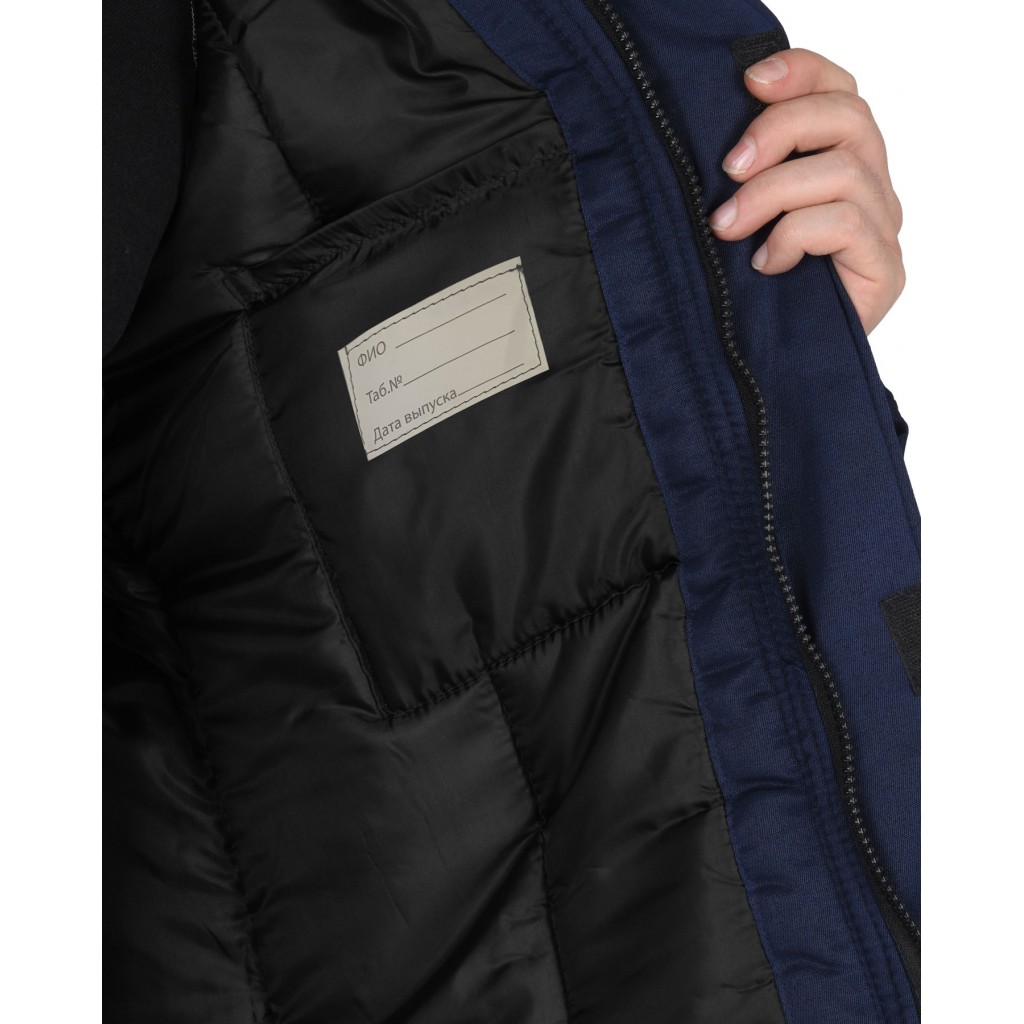 Куртка прямая, на утепленной подкладке, с втачным капюшоном, с центральной застежкой на молнию, накрытую ветрозащитным клапаном, с втачными рукавами, с накладными карманами, впереди и сзади в области груди и по низу рукавов световозвращающая лента 50 мм для обеспечения сигнальной видимости.