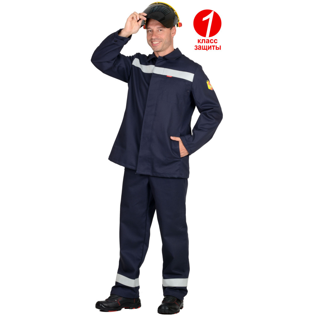 Костюм 1-ого класса защиты, предназначен для выполнения работ, при которых расстояние от работящего до источника искр и брызг расплавленного металла более 2-х метров.