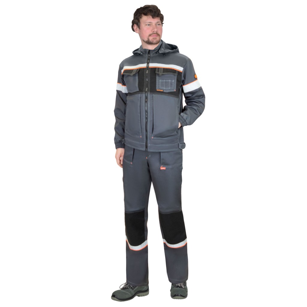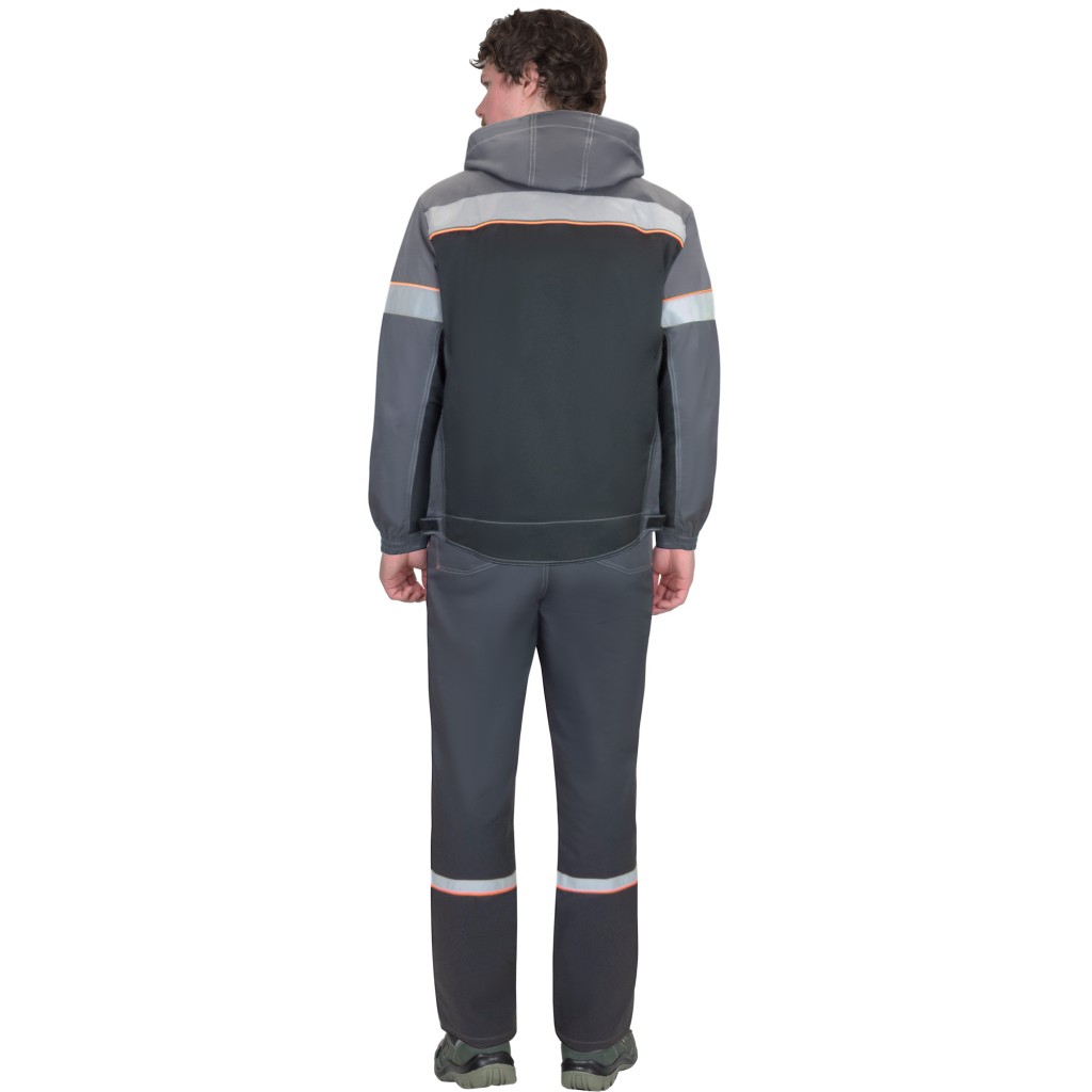 Куртка прямого силуэта, укороченная, с удлиненной линией низа на спинке, с центральной застёжкой на молнию и внутренней короткой планкой по правому борту, с воротником стойка, со съёмным капюшоном, с верхними и нижними карманами. Рукава втачные с манжетами, стянутыми резинкой. Ширина куртки понизу регулируется хлястиком с липучкой. В куртке предусмотрена лента светоотражающая для обозначения сигнальной видимости.