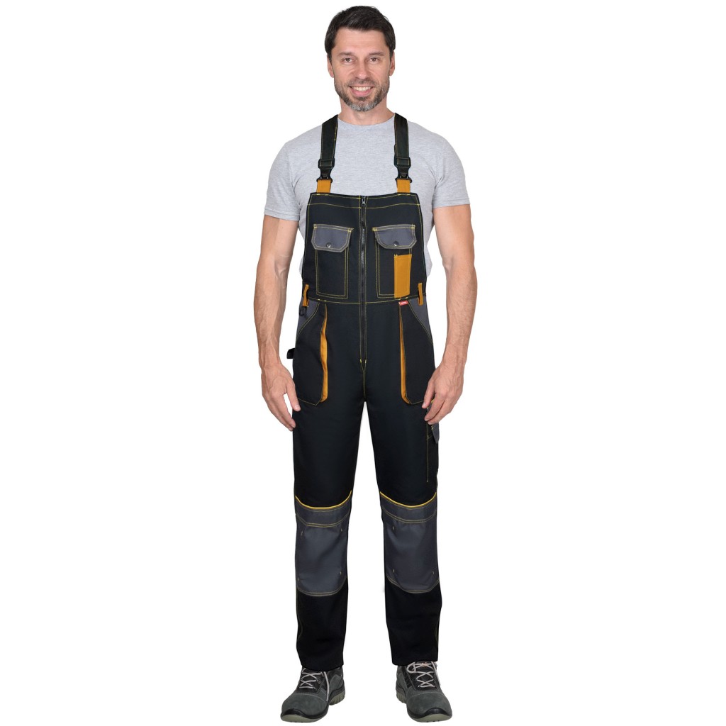 Полукомбинезон прямой с застёжкой спереди на молнию, с отрезной грудкой и отрезной спинкой, с бретелями. Полукомбинезон с накладными карманами спереди, сзади и на боковых швах, с объёмными наколенниками из плотной, непромокаемой ткани с верхним входом для амортизационного вкладыша. Бретели регулируются при помощи застежек-фастексов и резинки.
