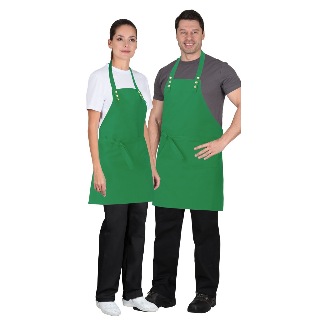 Фартук с нагрудником и с боковыми завязками для регулировки объема. Съёмная шейная бретель, пристёгивающаяся на кнопки. В нижней левой части накладной карман. На правой стороне фартука, на уровне притачивания боковых завязок, шлёвка.
