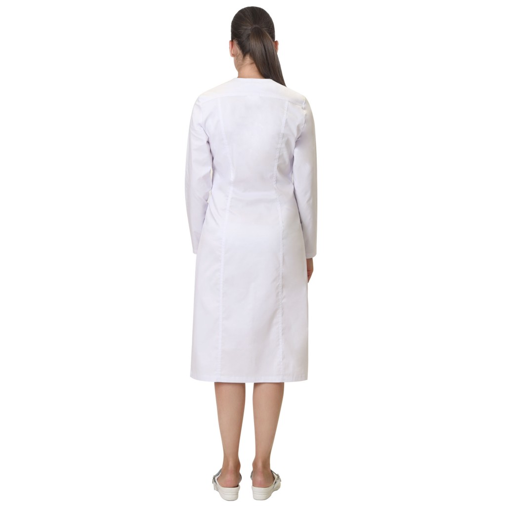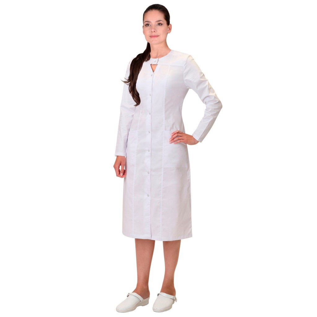 - Описание: Халат женский полуприлегающего силуэта, с центральной сквозной застёжкой на кнопки. Без воротника, с овальным вырезом горловины и нижними накладными карманами. Рукава втачные длинные.