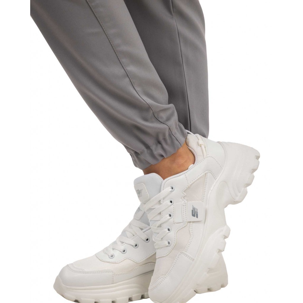 Брюки - джоггеры, зауженные, с отрезным поясом на резинку и резинкой по низу, с боковыми внутренними и задними накладными карманами.