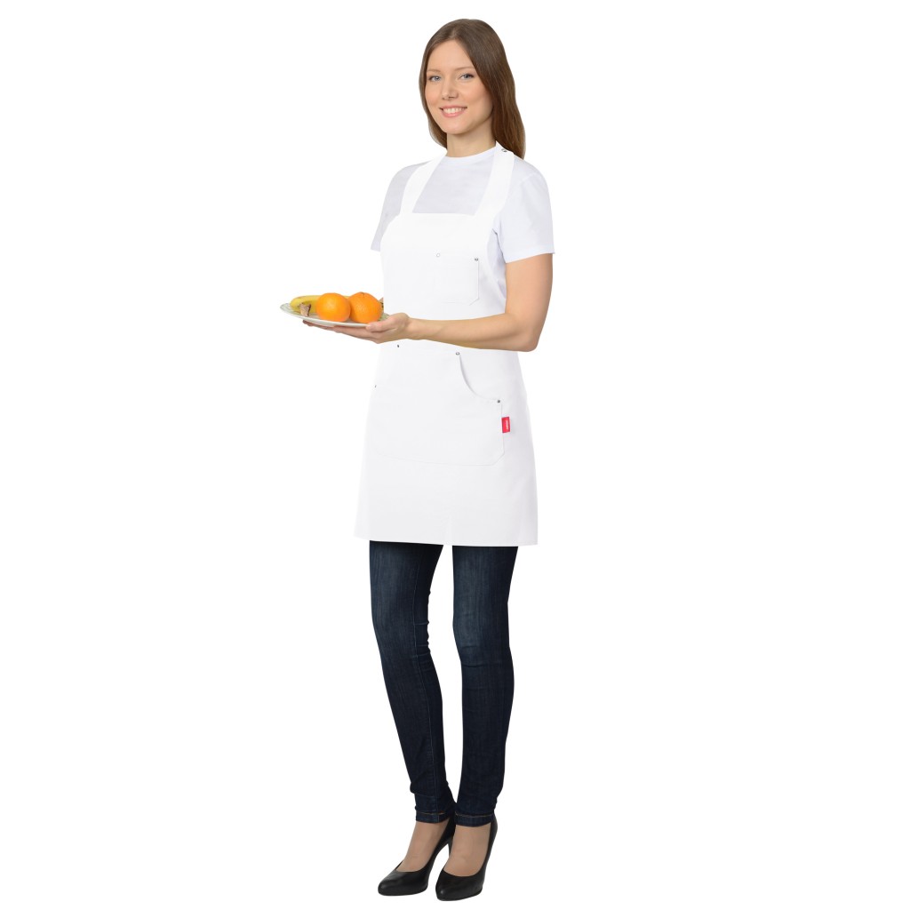 Фартук с нагрудником, с прямой линией низа и прямыми боковыми сторонами, боковыми завязками для регулировки фартука на фигуре, и шейной бретелью, застёгивающейся сзади на 3 кнопки справа налево для регулировки длины бретели по горловине. Фартук с большим накладным карманом с двумя боковыми входами и малым нагрудным карманом. Концы входа в карманы укреплены хольнитенами.