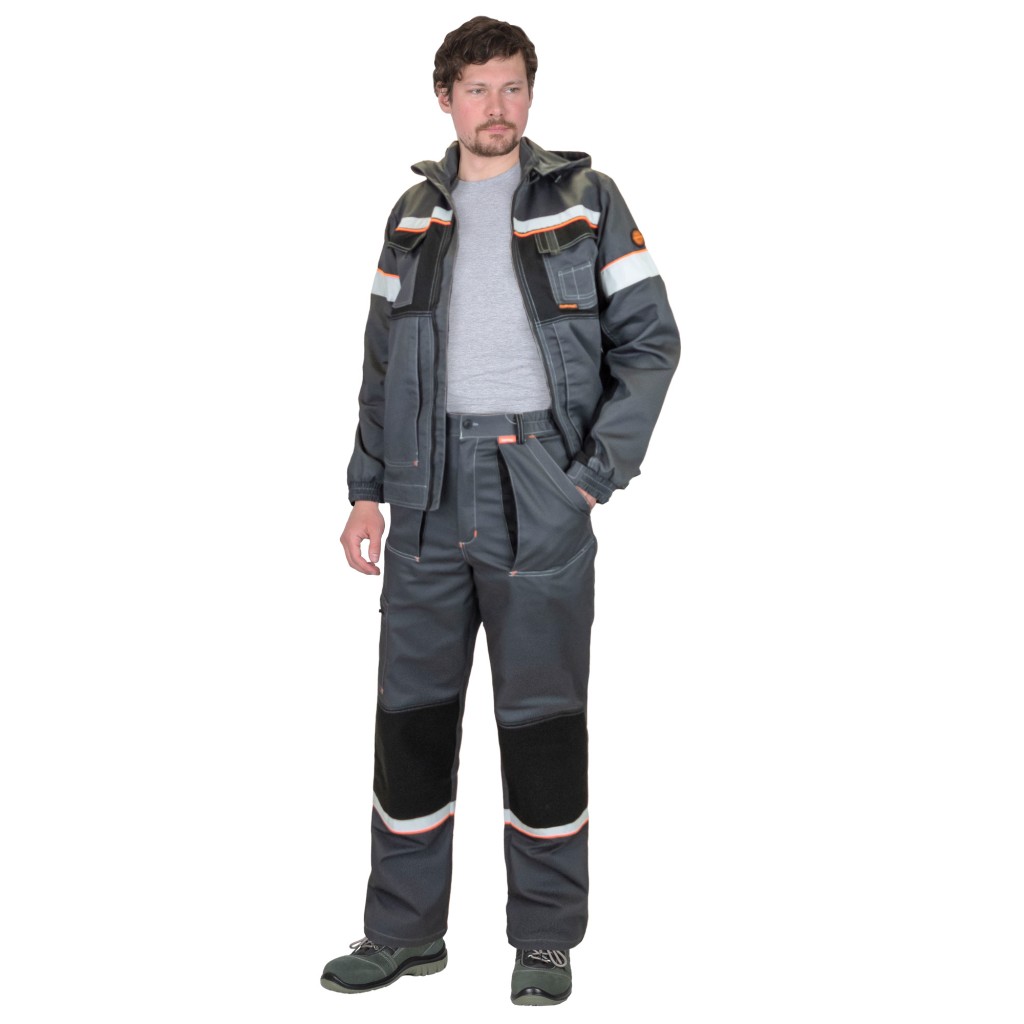 Брюки прямые, на поясе с эластичной лентой по боковым сторонам, с застёжкой на молнию спереди – гульфик, с передними и задними карманами и карманом на правом боковым шве с молнией, с наколенниками. В брюках предусмотрена лента светоотражающая для обозначения сигнальной видимости.