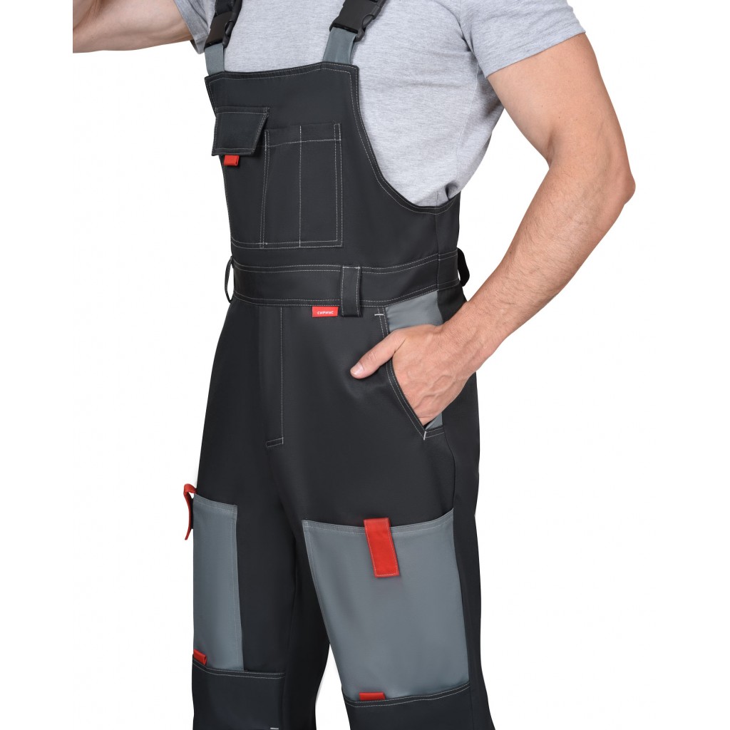 - Описание: Полукомбинезон с застёжкой в правом боковом шве на молнию и гульфиком, застегивающимся на молнию. Изделие с различными карманами, наколенниками и бретелями, регулируемыми по длине при помощи застежек-фастексов.