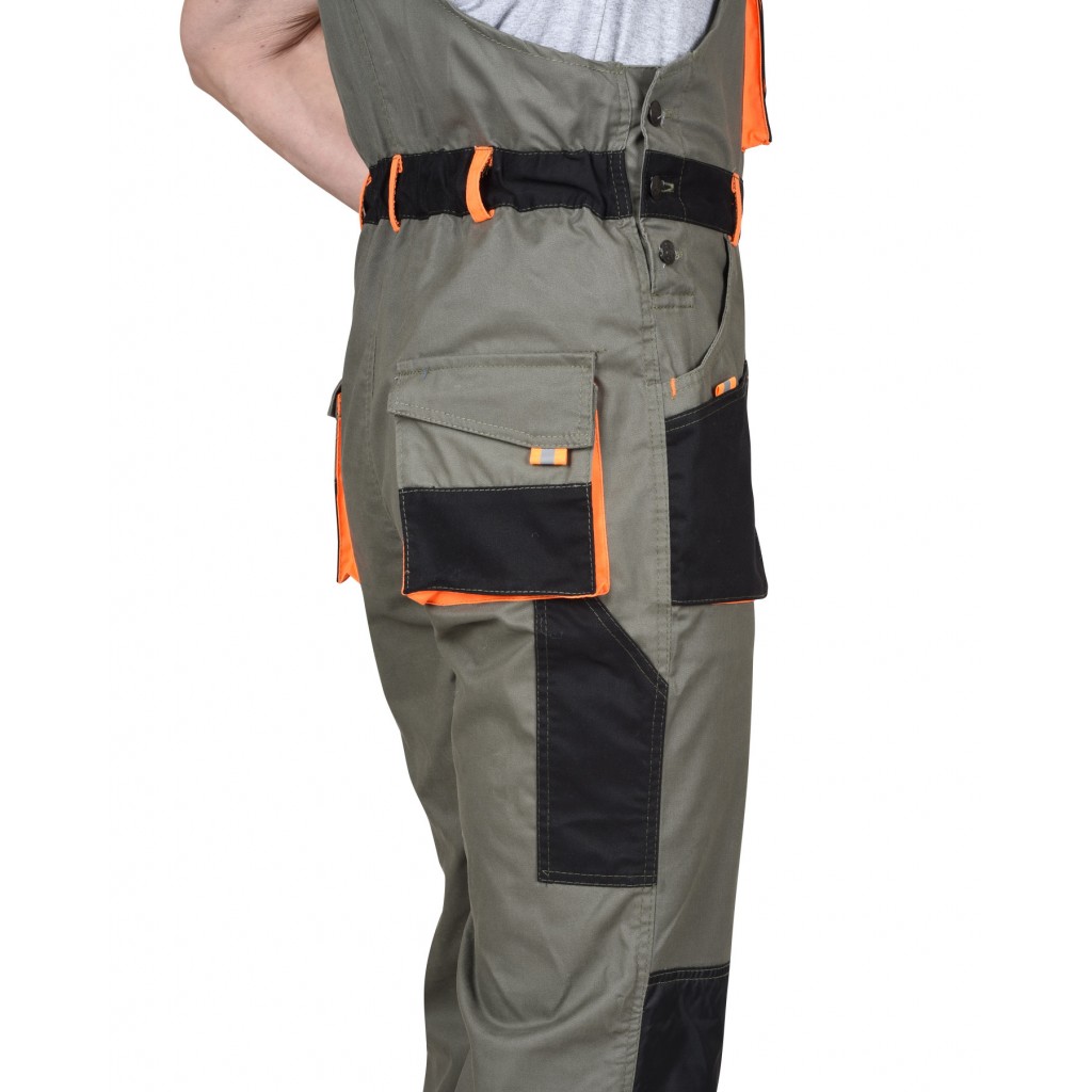 - Описание: Полукомбинезон с застежкой гульфика на «молнию» и с застежкой в правом боковом шве на три петли и три пуговицы , с нагрудным накладным большим и малым карманом и карманом для телефона, с боковыми внутренними карманами, с накладным карманом на левом боковом шве с клапаном на липучке, с наколенниками, с двумя задними карманами с клапанами , и карманом для инструментов, по спинке вставлена резинка.