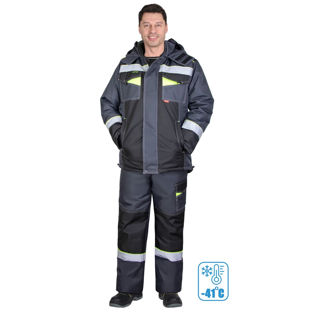 Костюм СИРИУС-ХОВАРД-М зимний, куртка длинная, брюки, темно-серый с черным, лимонной отделкой и СОП