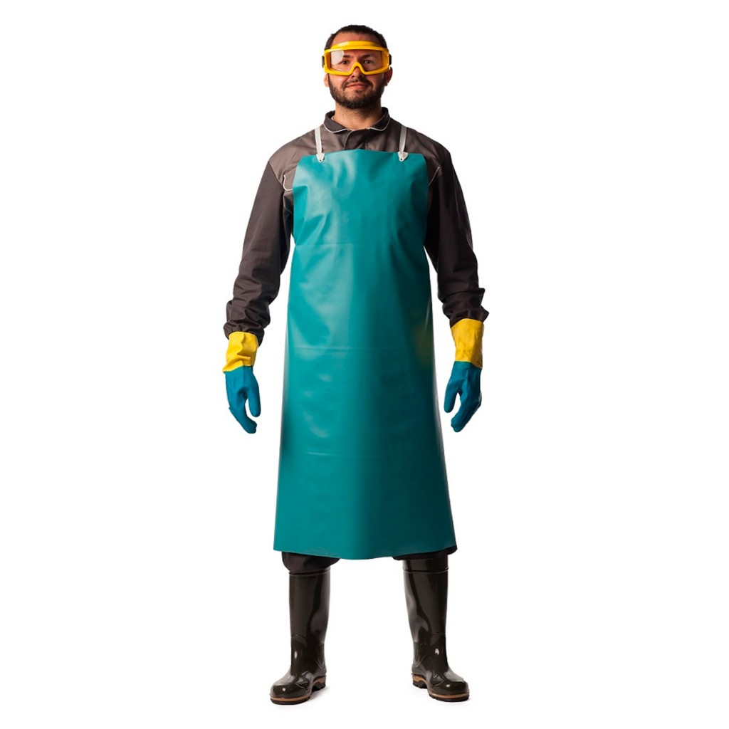• Описание: Прочный износоустойчивый фартук из уплотненного поливинилхлорида (ПВХ) предназначен для защиты от брызг кислот и щелочей концентрации до 80%, продуктов нефтепереработки, масел, жиров, лаков и красок на их основе при выполнении средних и тяжелых работ.
