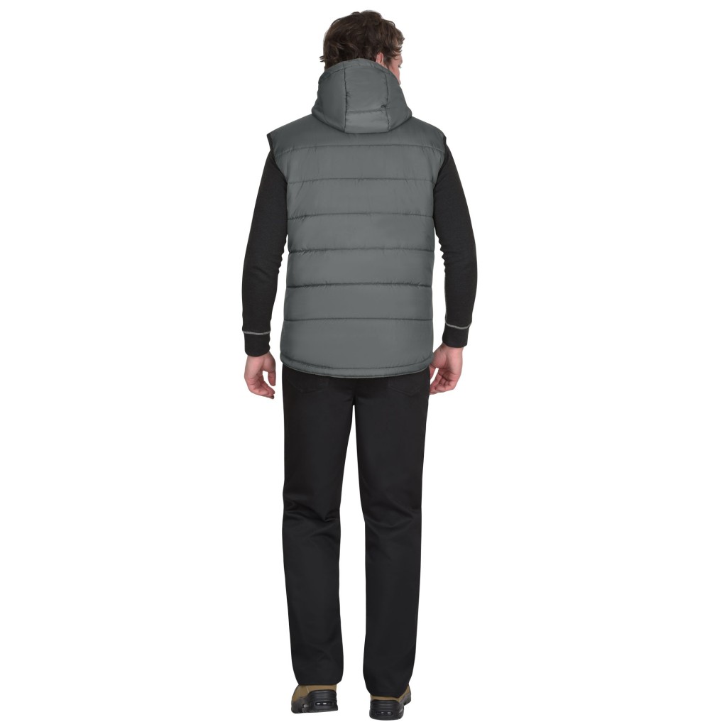 Жилет утеплённый, выстеган с утеплителем горизонтальными строчками, на подкладке, с втачным капюшоном, с застёжкой на молнию, закрытую ветрозащитным клапаном от края капюшона до низа изделия, застёгивающимся на кнопки. Жилет с одним нагрудным карманом с молнией и двумя нижними карманами. Спинка жилета, удлинённая с фигурной линией низа. Пройма окантована резинкой. Объём капюшона по лицевому вырезу регулируется шнуром с фиксаторами.